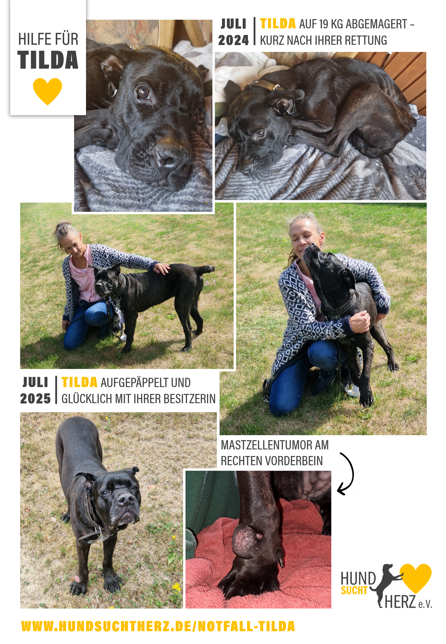 Tilda leidet an Mastzellentumoren, und einer dieser Tumore an ihrem rechten Vorderbein macht ihr große Probleme. Auch wenn Tilda ihren Kampf gegen diese Tumore vielleicht irgendwann verlieren könnte, möchten wir ihr nach ihrem früheren Martyrium mit eurer Unterstützung eine OP ermöglichen, mit deren Hilfe sie an der Seite von Sandra noch ein paar schöne Jahre genießen kann. Nach all der schweren Zeit, die Tilda früher durchgemacht hat, hat sie jetzt doch ‘mal ein bisschen Glück verdient, oder?
